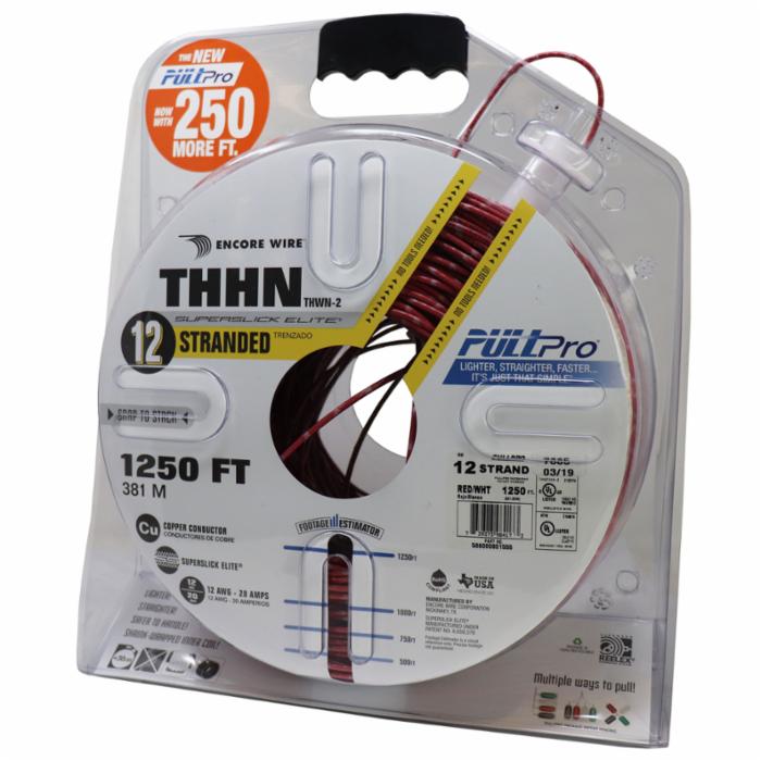 Encore Wire SuperSlick Elite® THHN Copper Building Wire, 12 AWG, Stranded, Red, White Stripe, (2) 1250 ft PullPro® Cartons