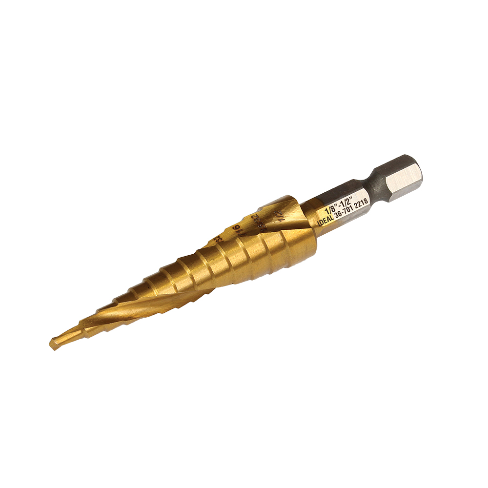 IDEAL® Spiral Step Bit, Split Point, 13 Steps, 1/8 in to 1/2 in Dia, 1/32 in Increments, 1/4 in Hex Shank