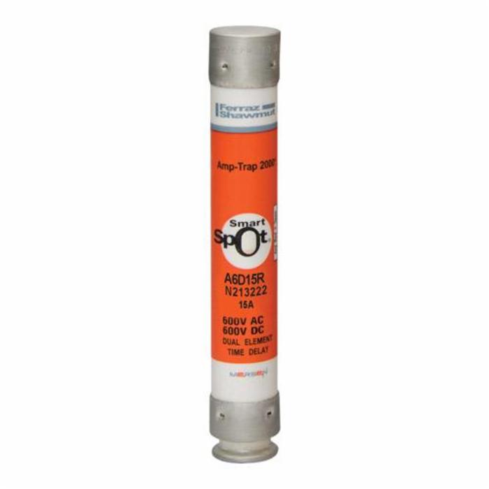 Ferraz Shawmut Amp-TrapĀ® 2000 SmartSpotĀ® Power Fuse, Current Limiting Low Voltage North American Time Delay, Series: A6D-R, Indicating, Rejection, 15 A, 600 VAC, 200 kA Interrupt, Class: RK1, Ferrule Terminal, Clip Mounting, Cylindrical Body, Dual Element, Polytube, 13/16 in Dia x 5 in L Body