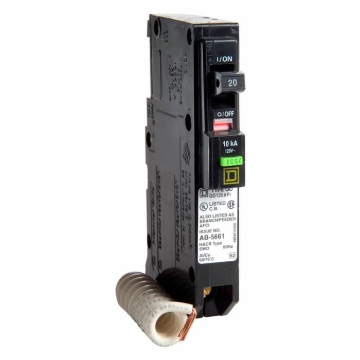 Square D™ Arc Fault Circuit Breaker, QO® Series, 1 Pole, 20 A, 120/240 VAC, 10 kA, Pressure Plate Connection, 12 to 8 AWG Al, 14 to 8 AWG Cu Wire, Plug In Mount, For Use With: QO® Load Center and NQ Series Panelboards, 4.75 in H x 0.75 in W x 2.91 in D