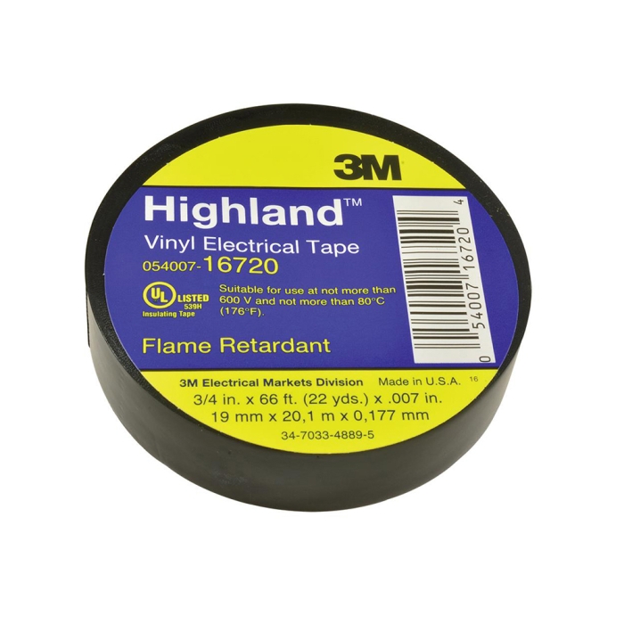 3M™ Highland™ Electrical Tape, 66 ft Length, 3/4 in Width, 7 mil Thickness, Vinyl Material Type, Black, Rubber Adhesive, Vinyl Backing, 18 in-oz Adhesion, 600 VAC, 1200 VAC/mil Dielectric, 15 in-lb Tensile, 176 deg F Maximum Operating Temperature
