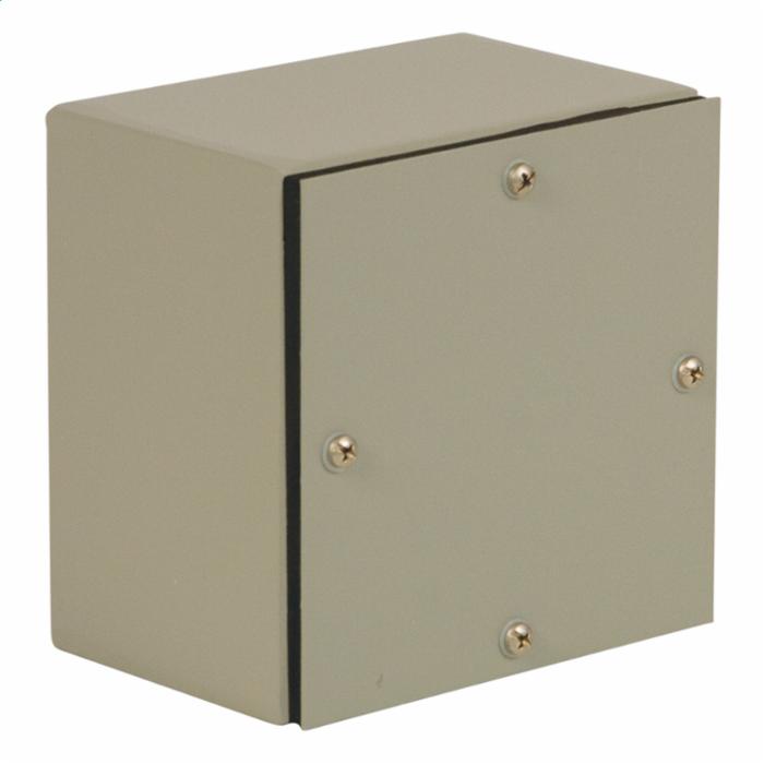 Bodies and covers fabricated from 14 gauge carbon steel. Seams are continuously welded and ground smooth. Cover contains closed cell oil resistant neoprene gasket. Enclosure comes with stainless steel cover screws which thread into sealed wells to prevent liquid, dust, etc. from entering into the box through the screw holes. Ground stud located in door. No holes, knockout, or rear mounting holes