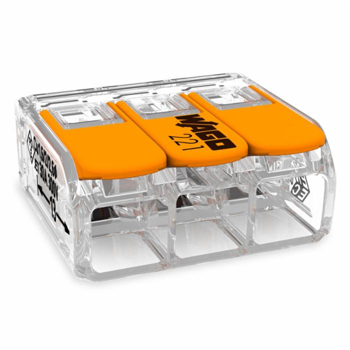 WAGO LEVER-NUTS® Splicing Connector, Compact, Series: 221, 450 VAC, 41 A, 3 Conductor, 20 to 10 AWG Solid/Stranded Wire, 0.47 to 0.55 in Wire Strip Length, 105 deg C, Transparent, 0.398 in H x 0.902 in W x 0.831 in D
