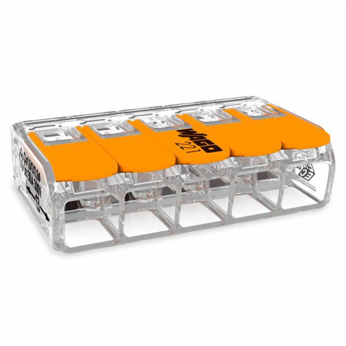 WAGO LEVER-NUTS® Splicing Connector, Compact, Series: 221, 450 VAC, 41 A, 5 Conductor, 20 to 10 AWG Solid/Stranded Wire, 0.47 to 0.55 in Wire Strip Length, 105 deg C, Transparent, 0.398 in H x 1.445 in W x 0.831 in D