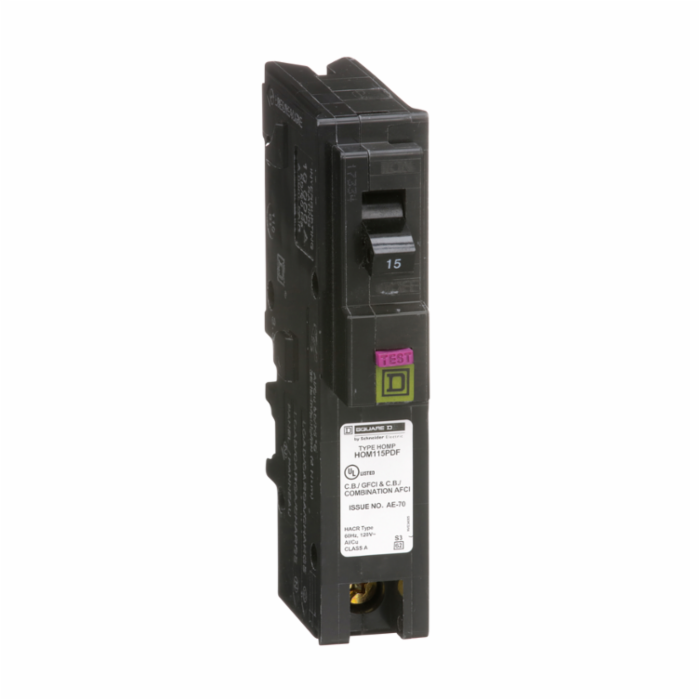 Square D™ Combination Arc Fault and Ground Fault Circuit Breaker, Homeline™ Series, 1 Pole, 15 A, 120 VAC, 10 kA, Screw Clamp Connection, 14 to 8 AWG Al/Cu Wire, Plug In Mount, For Use With: Homeline™ Load Center, 3.13 in H x 1 in W x 2.98 in D
