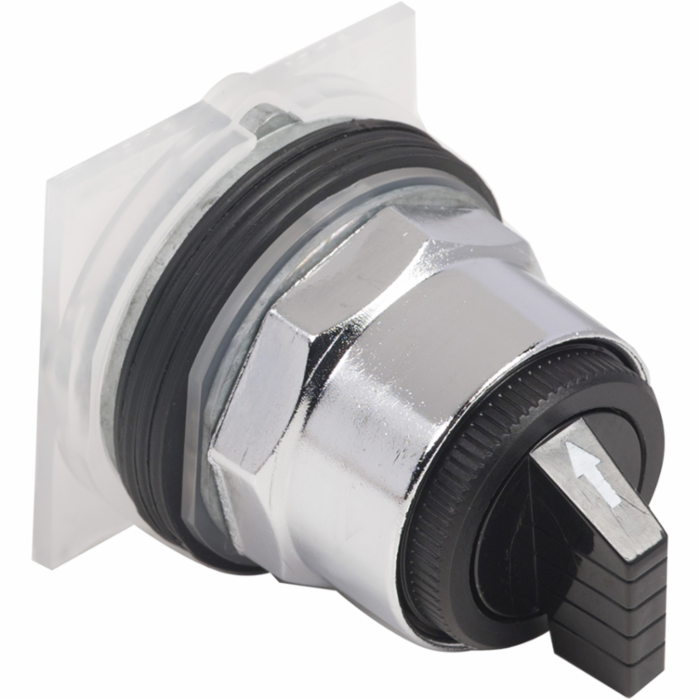 Square D™ Harmony™ 30 mm Non-Illuminated Selector Switch, Heavy Duty, Series: 9001K, Without Contact Block, Round Knob/Spring Return Operator, 3 Positions, Bezel/Housing: Chromium Plated Metal, Screw Clamp, NEMA 1/2/3/3R/4/6/12/13, Panel Mount, Black