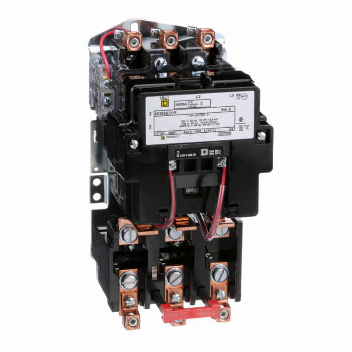 Square D non-reversing magnetic starter, NEMA Size 3, 50 HP maximum at 600 VAC, 3 pole, with 110/120 VAC, 50/60 Hz operating coil and melting alloy overload relay block, melting alloy type overload relay, UL Listed, CSA Certified, CE Marked, open style.