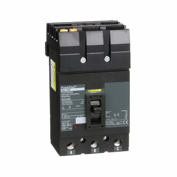 Square D™ Molded Case Circuit Breaker, Q-Frame, PowerPact™ Series, 3 Pole, 200 A, 240 VAC, 25 kA, Thermal Magnetic Trip, 1200 A Hold, 2400 A Trip, I-Line® Lug Connection, 4 AWG to 300 MCM Al/Cu Wire, I-Line Mount, 6.47 in H x 4.5 in W x 3.93 in D