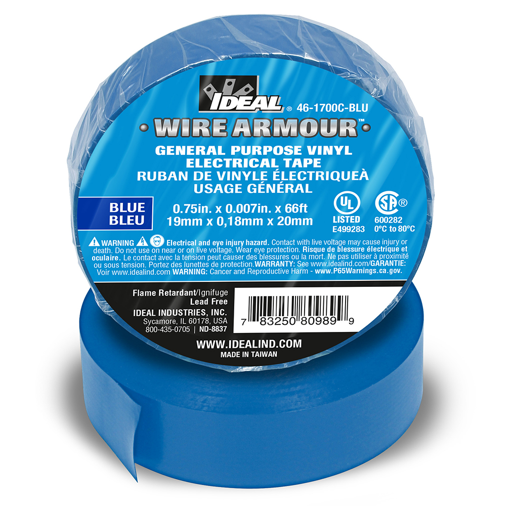 IDEAL® Wire Armour™ Electrical Tape, General Purpose, Series: Wire Armour™, 66 ft Length, 3/4 in Width, 7 mil Thickness, Vinyl Material Type, Blue, Rubber Adhesive, 16 in-oz Adhesion, 600 VAC, 7000 VAC Dielectric, 16 in-lb Tensile, 176 deg F Maximum Operating Temperature, 32 deg F Minimum Operating Temperature