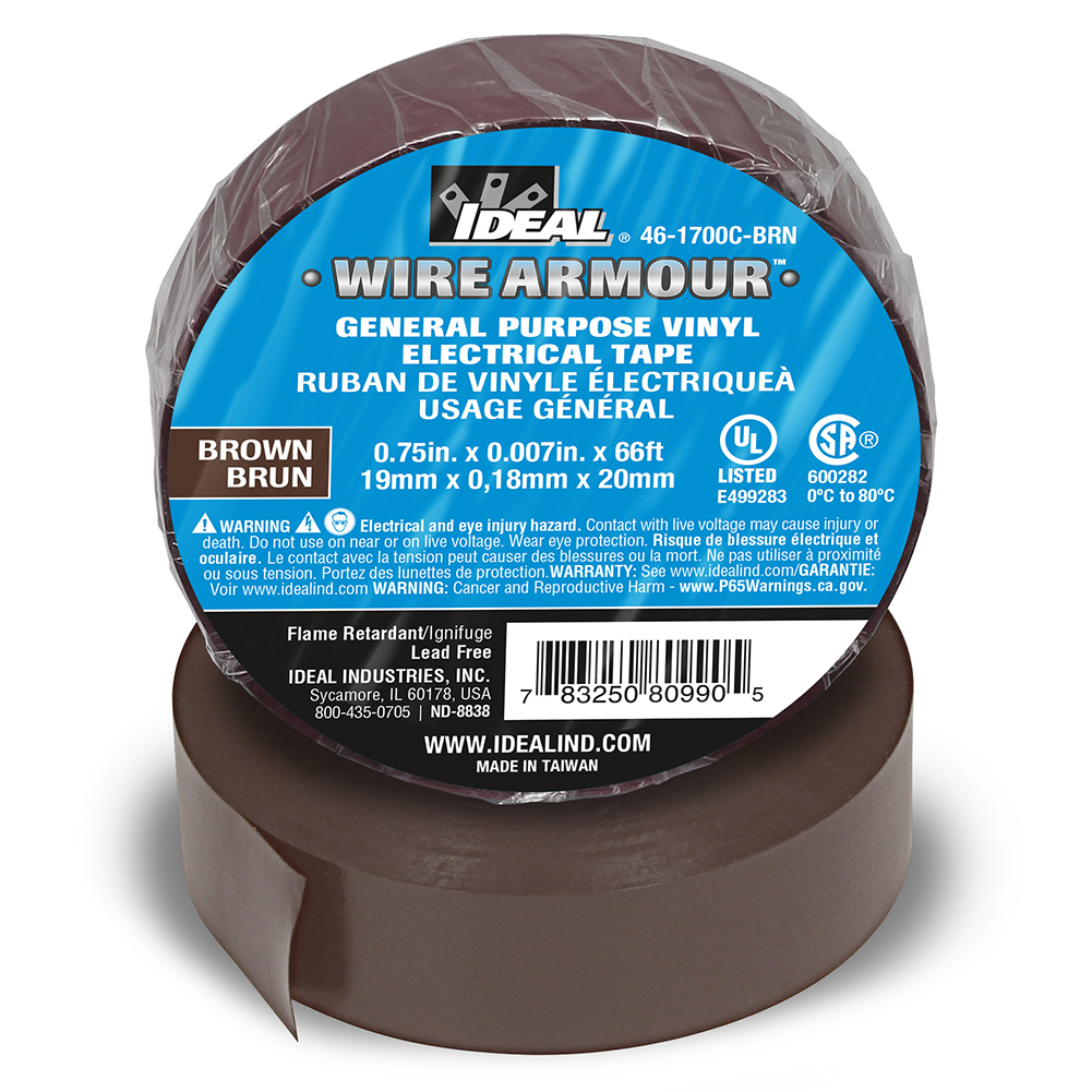IDEAL® Wire Armour™ Electrical Tape, General Purpose, Series: Wire Armour™, 66 ft Length, 3/4 in Width, 7 mil Thickness, Vinyl Material Type, Brown, Rubber Adhesive, 16 in-oz Adhesion, 600 VAC, 7000 VAC Dielectric, 16 in-lb Tensile, 176 deg F Maximum Operating Temperature, 32 deg F Minimum Operating Temperature