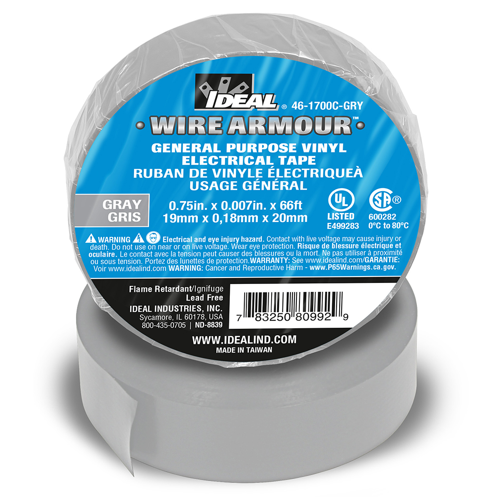 IDEAL® Wire Armour™ Electrical Tape, General Purpose, Series: Wire Armour™, 66 ft Length, 3/4 in Width, 7 mil Thickness, Vinyl Material Type, Gray, Rubber Adhesive, 16 in-oz Adhesion, 600 VAC, 7000 VAC Dielectric, 16 in-lb Tensile, 176 deg F Maximum Operating Temperature, 32 deg F Minimum Operating Temperature