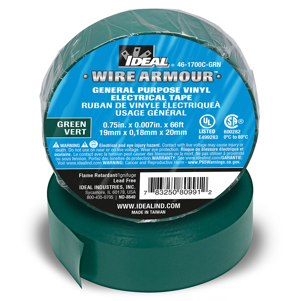IDEAL® Wire Armour™ Electrical Tape, General Purpose, Series: Wire Armour™, 66 ft Length, 3/4 in Width, 7 mil Thickness, Vinyl Material Type, Green, Rubber Adhesive, 16 in-oz Adhesion, 600 VAC, 7000 VAC Dielectric, 16 in-lb Tensile, 176 deg F Maximum Operating Temperature, 32 deg F Minimum Operating Temperature