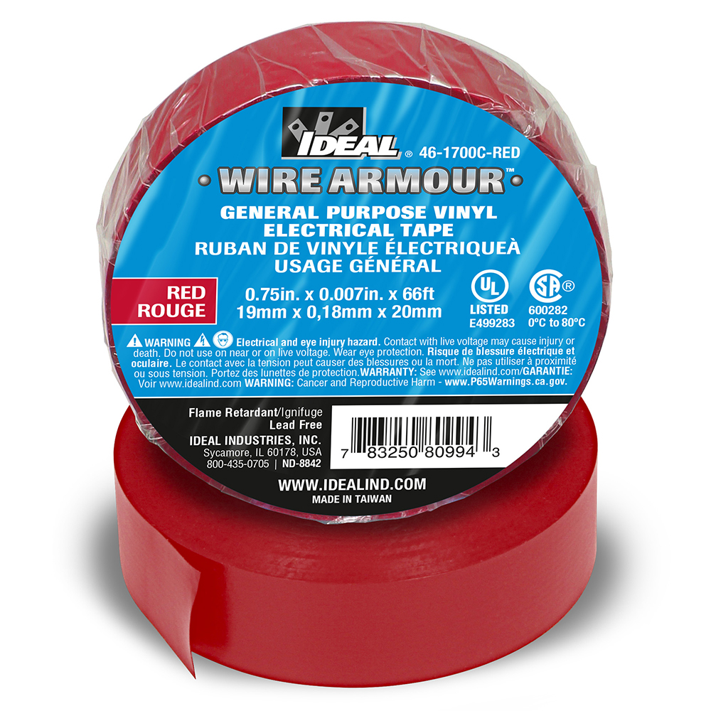 IDEAL® Wire Armour™ Electrical Tape, General Purpose, Series: Wire Armour™, 66 ft Length, 3/4 in Width, 7 mil Thickness, Vinyl Material Type, Red, Rubber Adhesive, 16 in-oz Adhesion, 600 VAC, 7000 VAC Dielectric, 16 in-lb Tensile, 176 deg F Maximum Operating Temperature, 32 deg F Minimum Operating Temperature