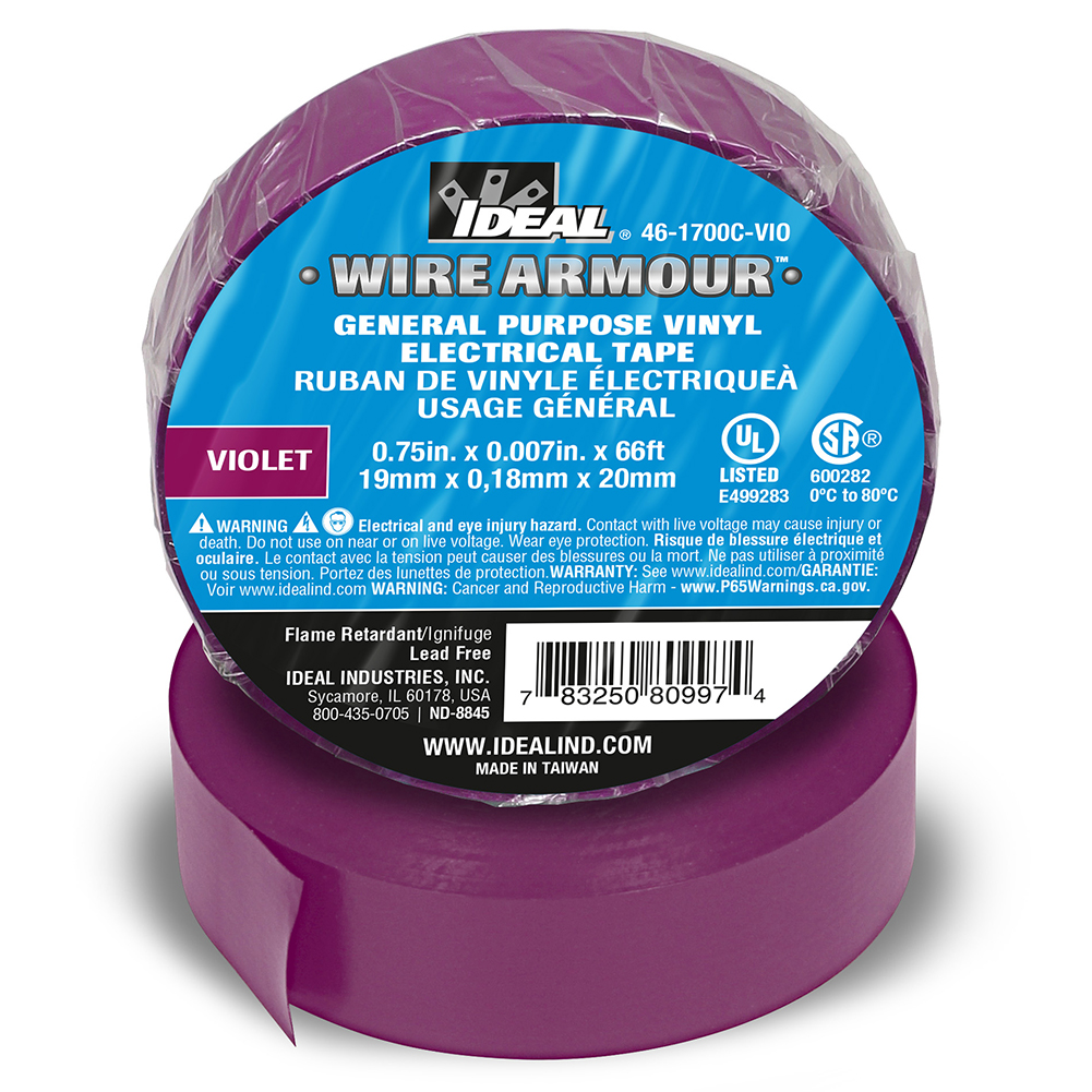 IDEAL® Wire Armour™ Electrical Tape, General Purpose, Series: Wire Armour™, 66 ft Length, 3/4 in Width, 7 mil Thickness, Vinyl Material Type, Violet, Rubber Adhesive, 16 in-oz Adhesion, 600 VAC, 7000 VAC Dielectric, 16 in-lb Tensile, 176 deg F Maximum Operating Temperature, 32 deg F Minimum Operating Temperature