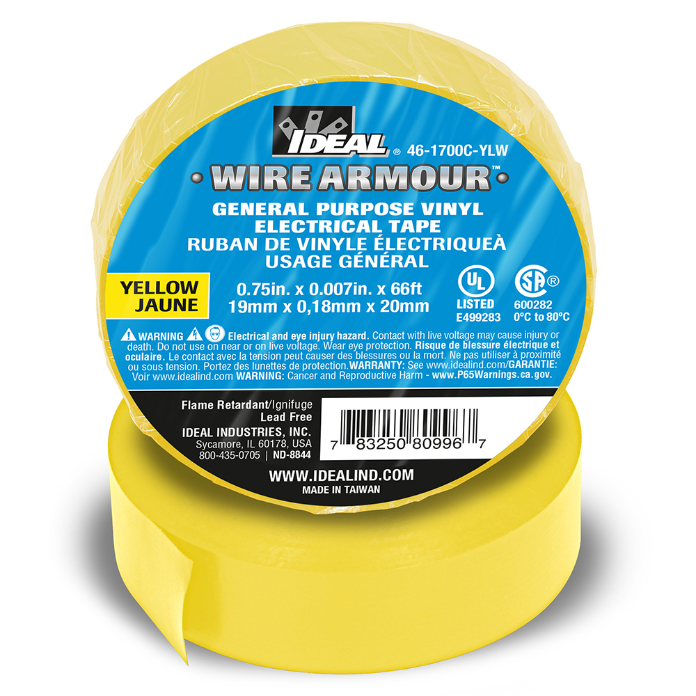 IDEAL® Wire Armour™ Electrical Tape, General Purpose, Series: Wire Armour™, 66 ft Length, 3/4 in Width, 7 mil Thickness, Vinyl Material Type, Yellow, Rubber Adhesive, 16 in-oz Adhesion, 600 VAC, 7000 VAC Dielectric, 16 in-lb Tensile, 176 deg F Maximum Operating Temperature, 32 deg F Minimum Operating Temperature