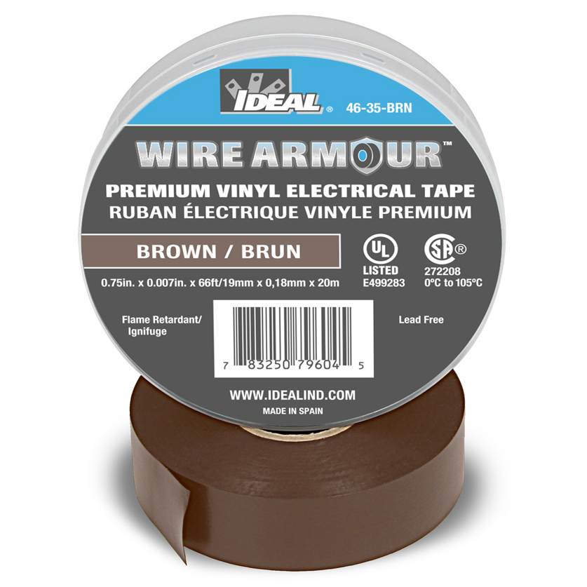 IDEAL® Wire Armour™ Electrical Tape, Premium Professional, Series: Wire Armour™, 66 ft Length, 3/4 in Width, 7 mil Thickness, Vinyl Material Type, Brown, Rubber Adhesive, 20 in-oz Adhesion, 600 VAC, 7500 VAC Dielectric, 17 in-lb Tensile, 221 deg F Maximum Operating Temperature, 14 deg F Minimum Operating Temperature