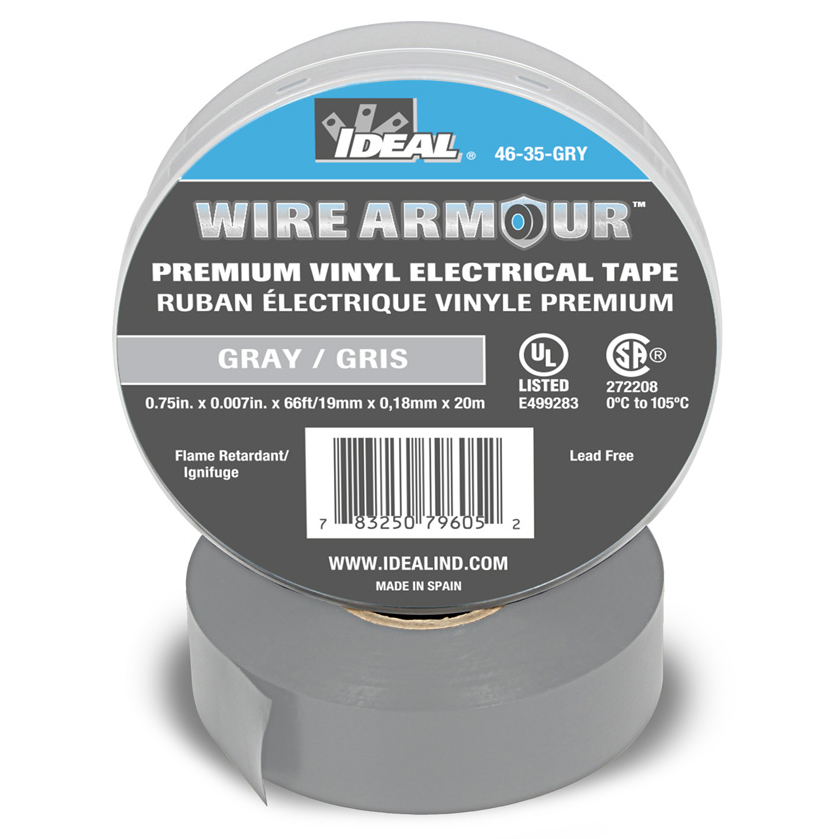 IDEAL® Wire Armour™ Electrical Tape, Premium Professional, Series: Wire Armour™, 66 ft Length, 3/4 in Width, 7 mil Thickness, Vinyl Material Type, Gray, Rubber Adhesive, 20 in-oz Adhesion, 600 VAC, 7500 VAC Dielectric, 17 in-lb Tensile, 221 deg F Maximum Operating Temperature, 14 deg F Minimum Operating Temperature
