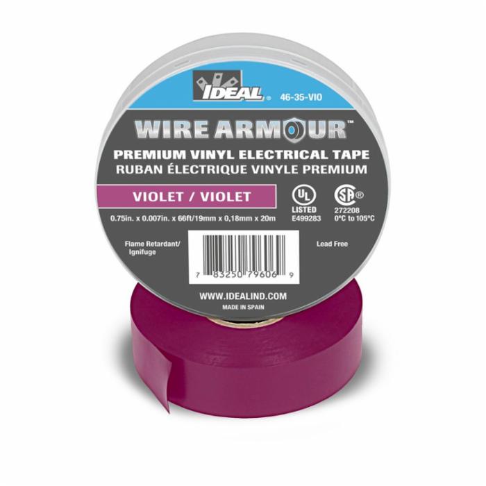 IDEAL® Wire Armour™ Electrical Tape, Premium Professional, Series: Wire Armour™, 66 ft Length, 3/4 in Width, 7 mil Thickness, Vinyl Material Type, Violet, Rubber Adhesive, 20 in-oz Adhesion, 600 VAC, 7500 VAC Dielectric, 17 in-lb Tensile, 221 deg F Maximum Operating Temperature, 14 deg F Minimum Operating Temperature