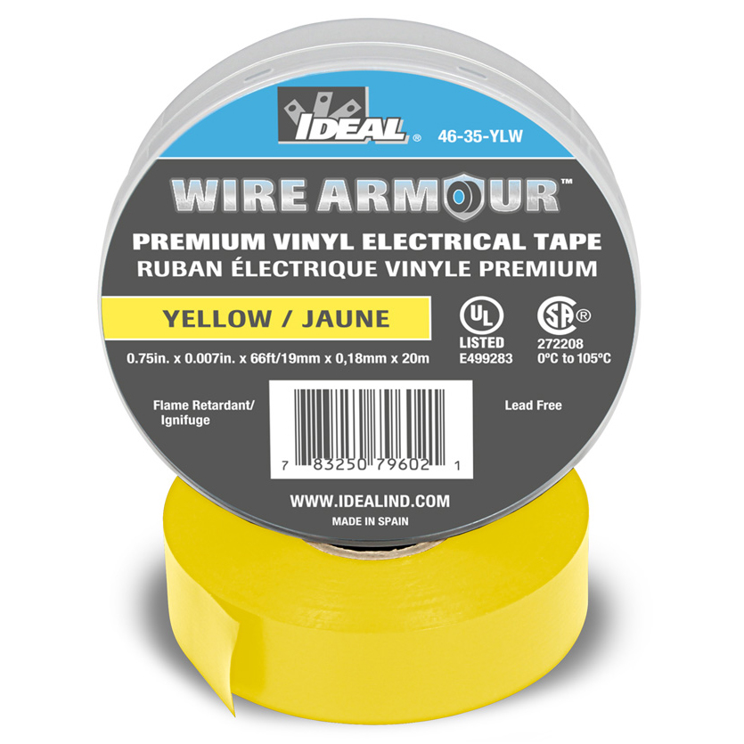 IDEAL® Wire Armour™ Electrical Tape, Premium Professional, Series: Wire Armour™, 66 ft Length, 3/4 in Width, 7 mil Thickness, Vinyl Material Type, Yellow, Rubber Adhesive, 20 in-oz Adhesion, 600 VAC, 7500 VAC Dielectric, 17 in-lb Tensile, 221 deg F Maximum Operating Temperature, 14 deg F Minimum Operating Temperature