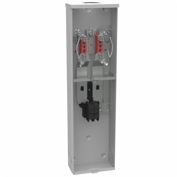 Milbank® Ringless Single Position Meter Socket With Main With Horn Bypass, 4 Jaw, 240 VAC, 200 A, 1 Phase, 60 Hz, Overhead Feed, 6 AWG to 350 MCM Wire, (1) 100 A Main Breaker, Small Hub Opening, Lay In Terminal, NEMA 3R Enclosure, Glass Polyester Insulation, Galvanized Steel, Powder Coat Finish, 30 in H x 8 in W x 4-1/8 in D