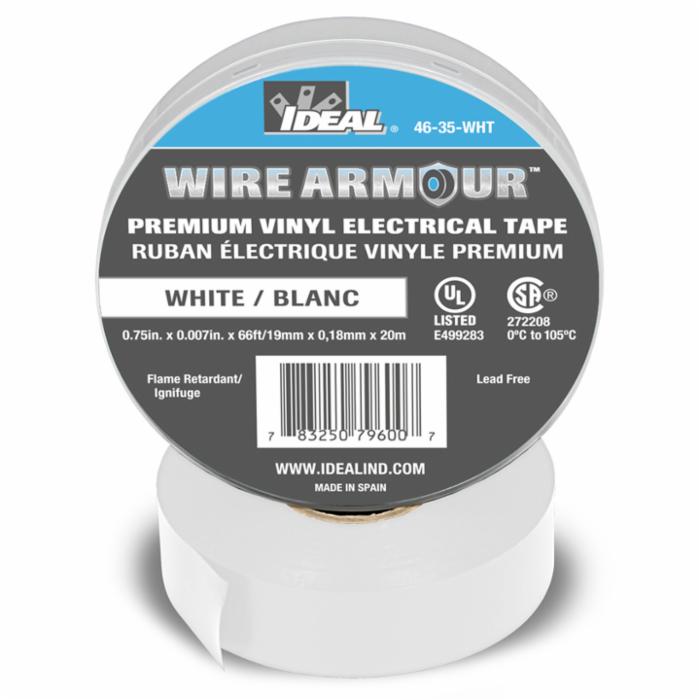 IDEAL® Wire Armour™ Electrical Tape, General Purpose, Series: Wire Armour™, 66 ft Length, 3/4 in Width, 7 mil Thickness, Vinyl Material Type, White, Rubber Adhesive, 16 in-oz Adhesion, 600 VAC, 7000 VAC Dielectric, 16 in-lb Tensile, 176 deg F Maximum Operating Temperature, 32 deg F Minimum Operating Temperature