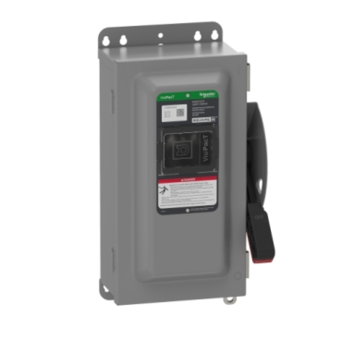 Square D™ VisiPacT Fusible Heavy Duty Single Throw Safety Switch with Viewing Window, 600 VAC/VDC, 60 A, 3 Pole, 3 Wire, 200 kA Short Circuit, NEMA 12 Enclosure, Ground Lugs, Surface Mount, Lug Terminal, Steel, 16.54 in H x 8.9 in W x 7.16 in D