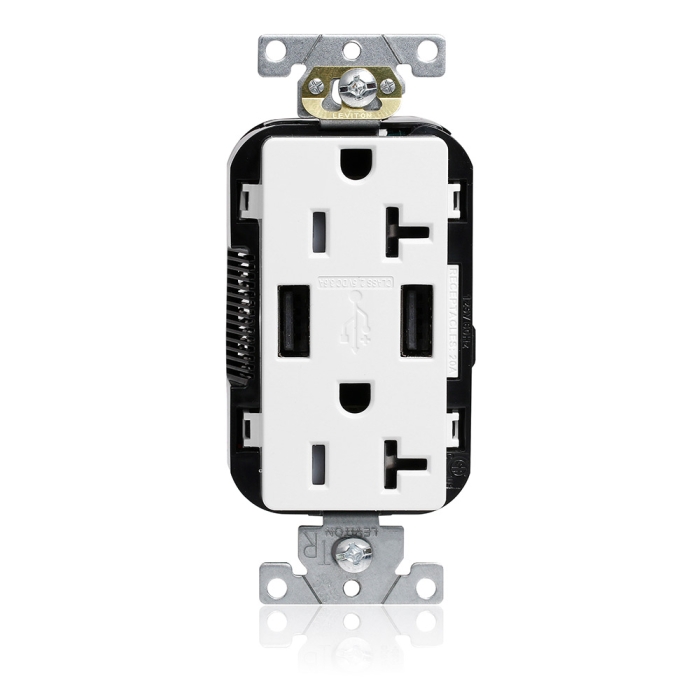 Leviton® Decora® Combination Tamper Resistant Duplex Receptacle and USB Charger, 20 A, 125 VAC, 2 Pole, 3 Wire, 3.6 A USB, Commercial Grade, Grounding, Back and Side Wired, White