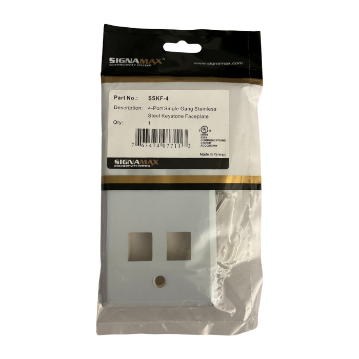 SIGNAMAX Keystone Faceplate, 1 Gang, 4 Port, Standard Size, Flush Mount, Stainless Steel