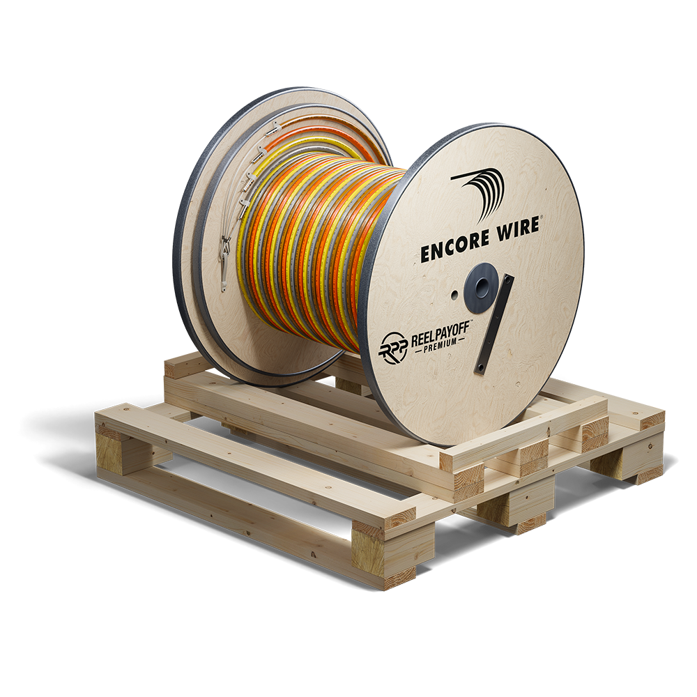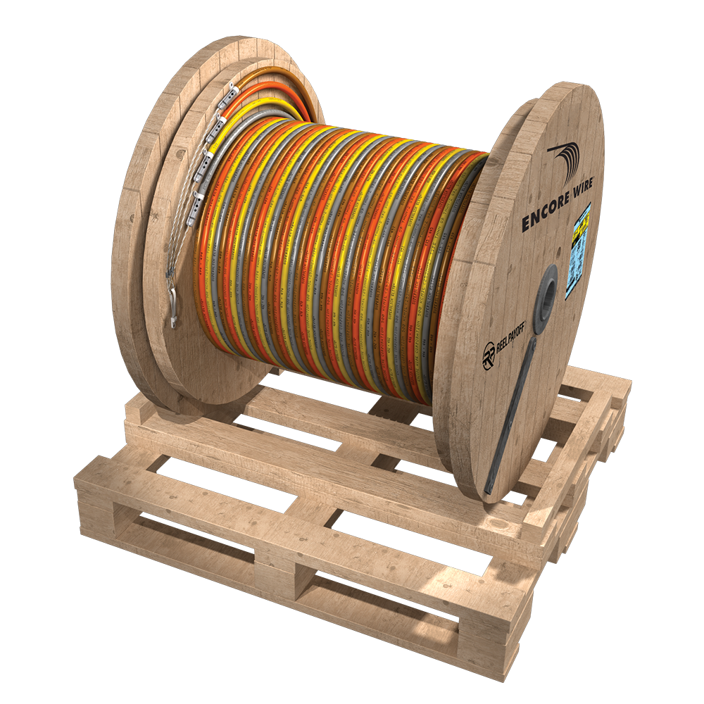 Encore Wire’s Reel Payoff is the industry’s first self-spinning wooden reel! Delivered on a custom 4-way pallet, the Reel Payoff is easy to pick up and position, reducing material handling cost and possible damage to the wire. All Reel Payoffs are shipped in roll-off position, making it easy to place in your desired location or pull straight from the pallet. In a tight spot? The Reel Payoff rotates within its own axis for 360-degree maneuverability.